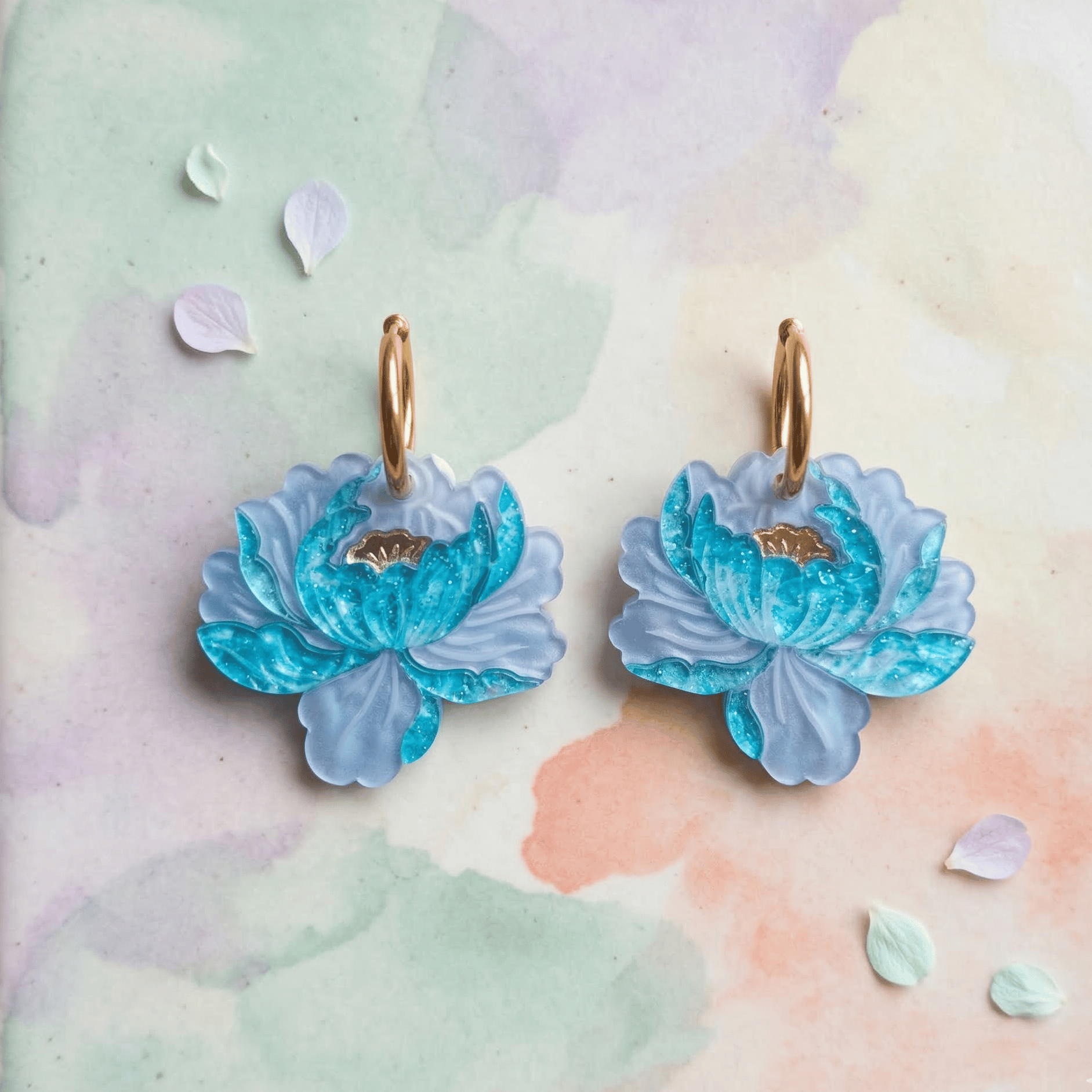 Estos pendientes de Flor de Loto han sido diseñados para capturar la luz y la serenidad del agua. Combinan pétalos en un suave azul nacarado con detalles en metacrilato con purpurina (glitter) que brillan como el reflejo del sol sobre el mar, coronados con un centro en espejo dorado que ilumina el conjunto.