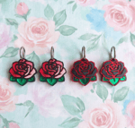 Dale un toque de distinción a tu estilo con estos pendientes de rosa, una pieza donde la delicadeza del diseño floral se encuentra con acabados de alta calidad. El contraste entre el metacrilato negro mate de la base y los pétalos en rojo nacarado crea una profundidad visual fascinante que cambia según la luz.