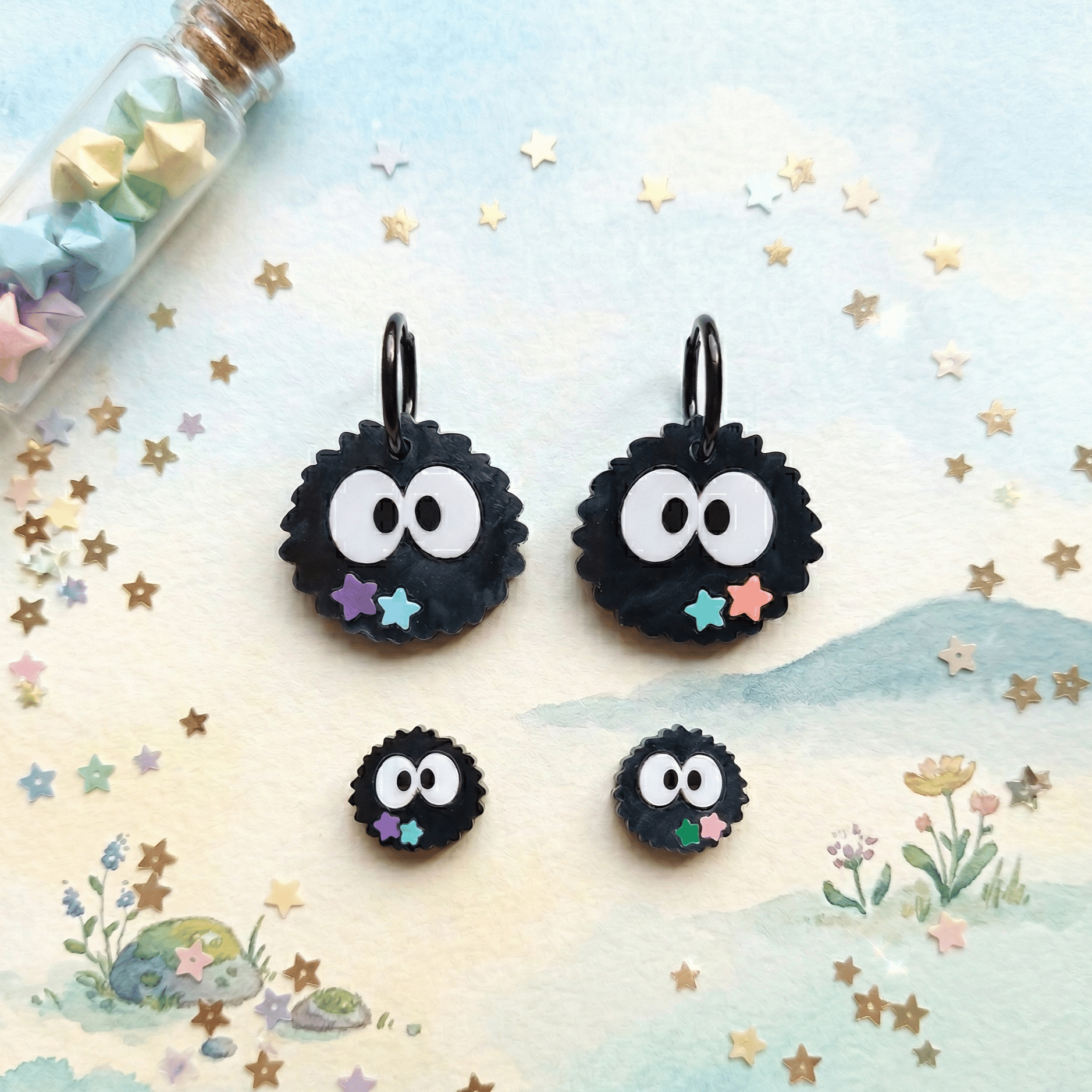Cada Susuwatari está fabricado en un exclusivo metacrilato negro nacarado, un acabado premium que le da profundidad y un brillo irisado sutil, haciendo que cada pieza sea única. Para completarlos, llevan sus icónicas estrellas de colores (konpeitō), dándoles ese toque dulce y característico. Son ligeros, divertidos y perfectos para cualquier fan de Studio Ghibli.
